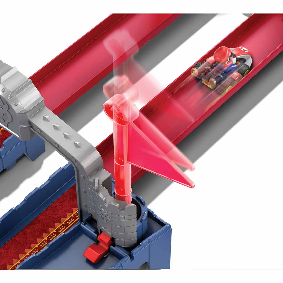 Yan yana yarış imkanı, turun bittiğini gösteren yarış bayrakları ve diğer setlere bağlanabilme özelliği ile bu pist setinde sizi heyecan verici deneyimler bekliyor. Rakibinizi yenmek ve yarışı kazanmak için Bowser’ın yumruklarından kaçıp eğimli virajdan dönerek 5 turu tamamlamanız gerekir. Bir adet replika metal Yoshi aracı dahildir. Pisti yeniden inşa edip diğer Mario Kart setlerine bağlayarak hem zorluk seviyesini hem de eğlencenin dozunu artırabilirsiniz.