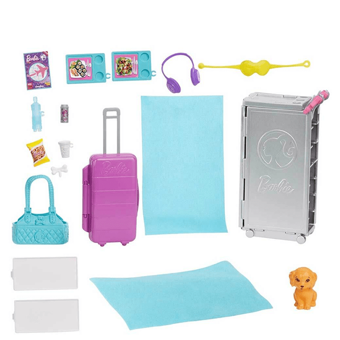 Ayrıca Barbie’nin sevimli köpeği de uçakta da onları yalnız bırakmıyor. 15’den fazla aksesuarın yer aldığı set içerisinde; Barbie’nin pembe uçağı, yemek arabası, çeşitli yiyecekler, battaniye, valiz, kulaklık, dergi, göz bandı, çanta, sevimli yavru köpek gibi çeşitli aksesuarlar yer almaktadır.