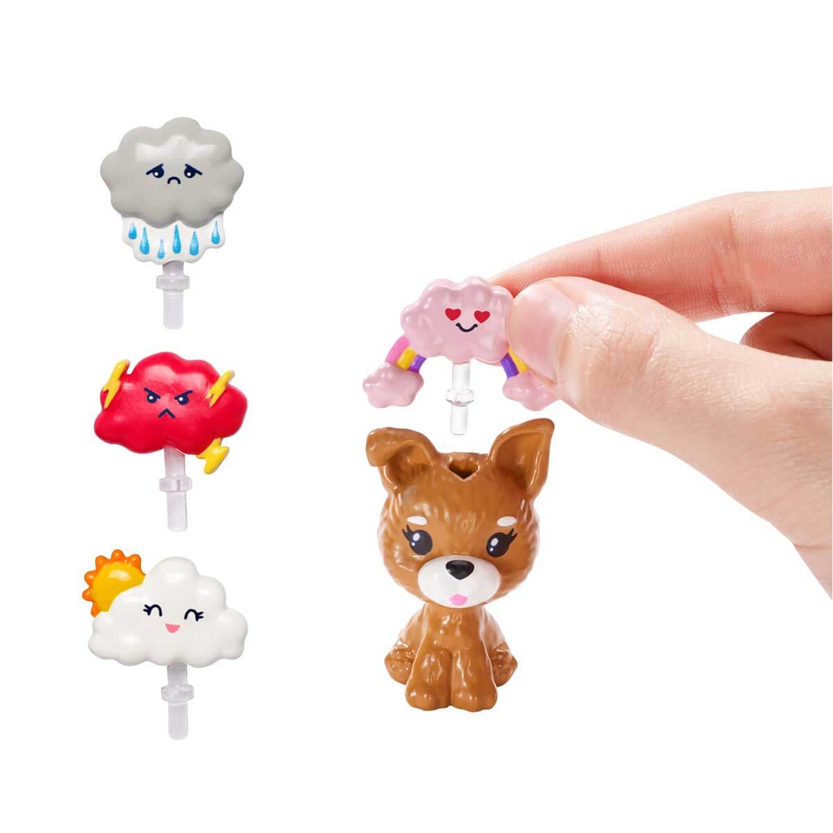 Sete Barbie bebek, bir köpek ve bulut şeklinde dört emoji dahildir.